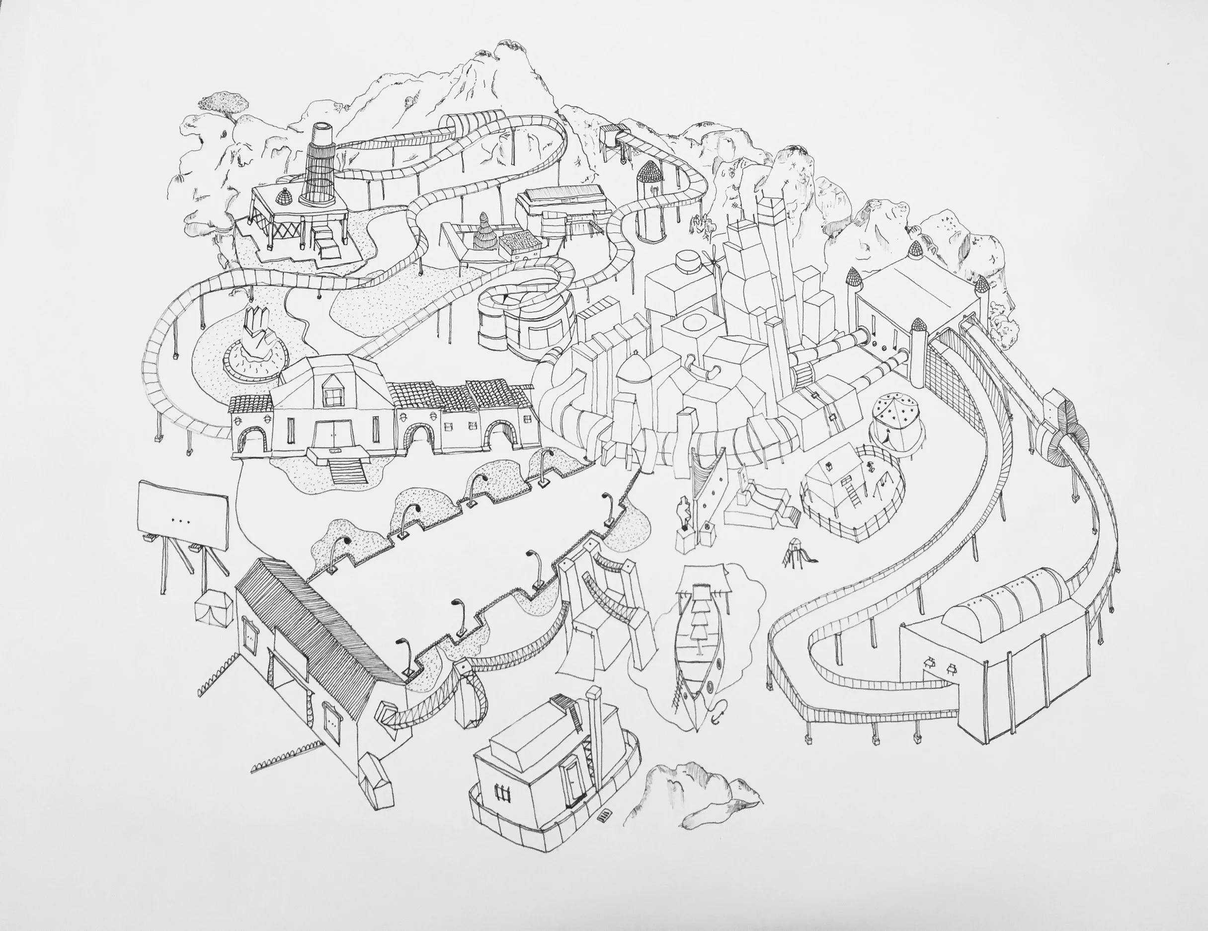Les feuilles sont peuplées de personnages, animaux, immeubles, objets du quotidien. Les protagonistes se perdent dans le blanc de la feuille, les architectures sont chargées de détails et s’accumulent.