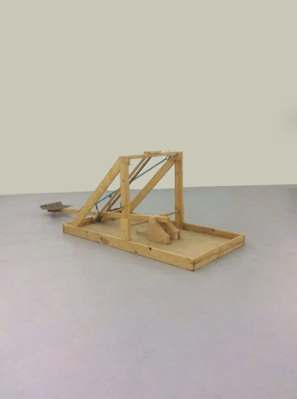 La catapulte est tendue, prête à l’attaque. Il s’agit de laisser le choix au spectateur de catapulter, détruire, lancer ce qu’il veut dans l’espace d’exposition.