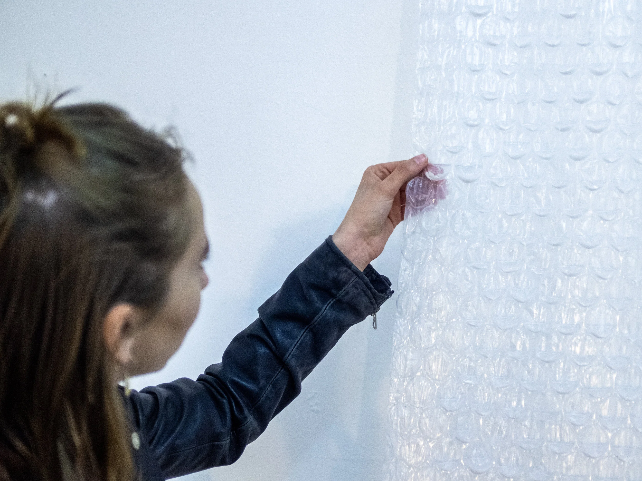Le papier bulles n’a plus les mêmes fonctions, il ne protège plus. La main perce les bulles, le son retentit, l’air est parti et le liquide jaillit.